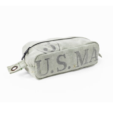 This dopp kit is upcycled from mail bags retired from the USPS. Handmade from repurposed materials, this travel bag features grommets on each end salvaged from the mail bags. Because pattern pieces are cut from assorted mailbags, each bag is one-of-a-kind. Product details, like color and fabric patterns, may vary slightly.